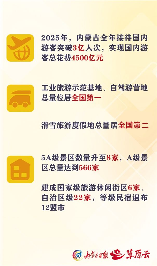 数据说话,最有分量。2025年,内蒙古全年接待国内游客突破3亿人次,实现国内游客总花费4500亿元。